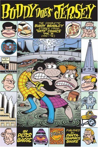 At the end of Buddy Does Seattle, with his rock-impresario career in tatters, his friends dispersed, and his career opportunities at zero, Buddy had decided to return with his tail between his legs (and his neurotic girlfriend Lisa on his hands) to his native New Jersey. Buddy Does Jersey collects all 15 issues of Hate describing the arc of Buddy's East Coast experience, including his launch as a small businessman (co-owning and running a nostalgia store with the dubious Jay) and his reintegration with his family (his sister now a tired mom, his brother still pretty much a psycho, and his parents — well, wait and see). Also included in this volume is the shocking final fate of the exuberant Stinky — a story that caused jaws to drop in unison all around the world when it was originally released.